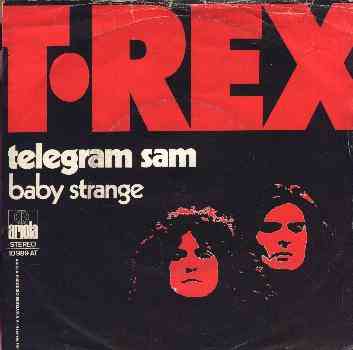 "Telegram Sam" (1972) became T. Rex's third U.K. number one. This was followed by a fourth, "Metal Guru". "The Slider" album, became a Top five hit in July 1972. T. Rex's seventh straight Top Ten single, "Children of the Revolution," became the first single to break the run of number 1's, peaking at 2. "Solid Gold Easy Action" in December also made number 2. March 1973 saw the release of"20th Century Boy," the ninth T. Rex Top Ten single and possibly now the most famous today, due to it's use in a "Levi", advert featuring a young Brad Pitt, in 1991."Tanx" the album, featuring Marc sitting on a small tank in a suggestive way,also went top 10 In June 1973, "The Groover" famous for it's intro shout of T-R-E-X! became the groups's tenth and final Top Ten single. |