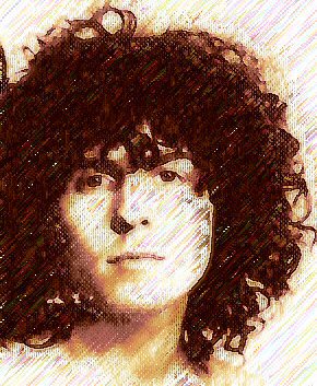In 1970 Marc shortened the group name to T. Rex. The change worked as later that year they achieved a no 2 U.K. hit with "Ride a White Swan," the first of ten straight Top Ten hits, and the album "T. Rex" was well received. The group was enlarged to include bass player Steve Currie and drummer Bill Legend (real name Fifield), T. Rex were now a full-fledged electric band, and scored number one hits in 1971 with "Hot Love" and "Get It On." Renamed "Bang a Gong " the song became T. Rex's only notable U.S. hit, making the Top Ten in 1972. The album "Electric Warrior" (1971) was released and is still thought by many to be T.Rex's finest hour. It topped the U.K. charts and "Jeepster" was lifted from it as a single by the record company,apparently against Marc's wishes. |